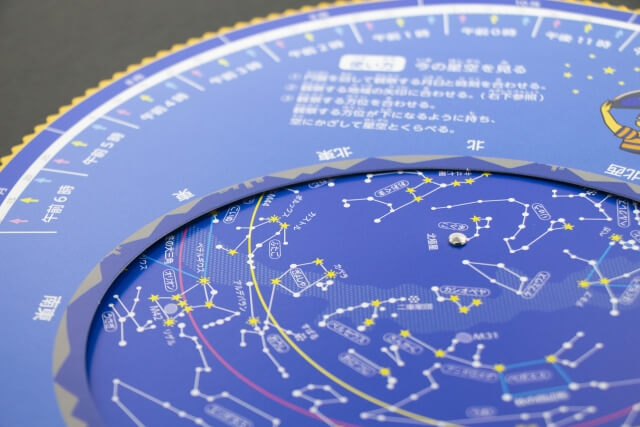星座早見盤は、2枚の円盤が重なってできていて、上の円盤には方角や時刻、下の円盤には日付や星・星座などが書かれています。日付は、1月から12月まで時計回りに記されていて、時刻は星座早見盤によってさまざまです。
